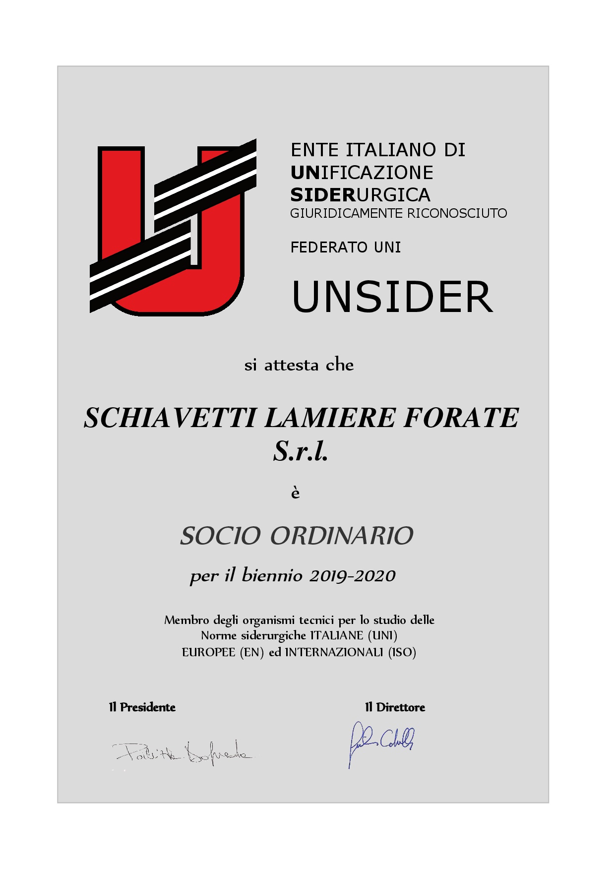 Schiavetti Lamiere forate ha rinnovato l’adesione a UNSIDER (Ente Italiano di Unificazione Siderurgica) e ha ottenuto l’attestato per la partecipazione alle attività normative che si sviluppano in ambito nazionale (norme UNI), europeo (norme EN) ed internazionale (norme ISO).